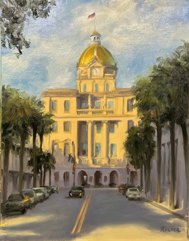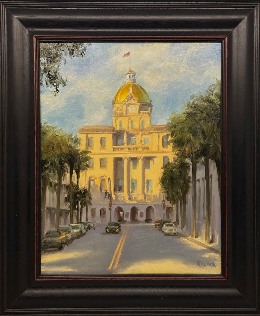 I was hoping for great weather so I could capture the afternoon sunlight illuminating the golden dome of the City Hall of Savannah - and my wish came true! The beautiful gleaming dome was almost blinding in its intensity and the violet shadows cast onto the street that leads to the front of the building were a wonderful contrast to all the warm yellows and golds!