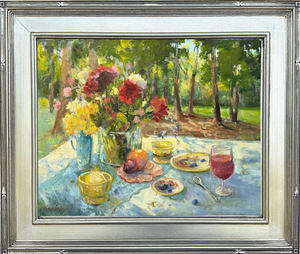 This plein air painting was very fun to set up and then paint in my yard. It's a challenge to paint the shifting, cast shadows so I made a commitment to their placement early on. It is meant to evoke a respite from crazy and troubling times.