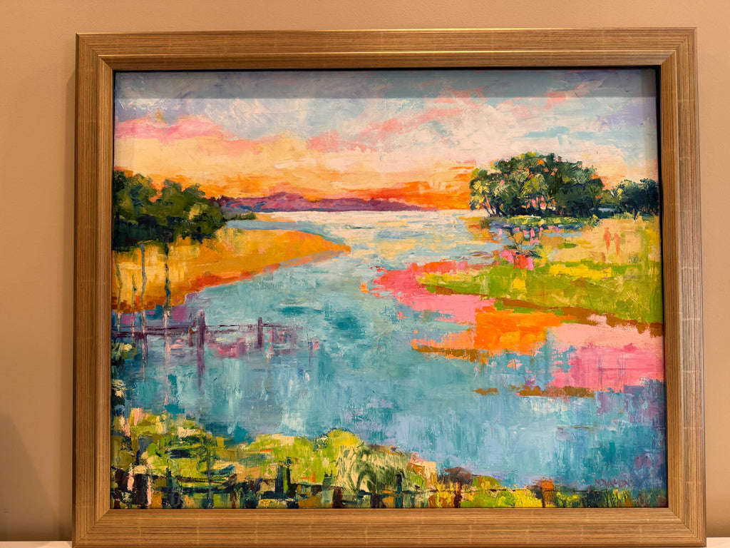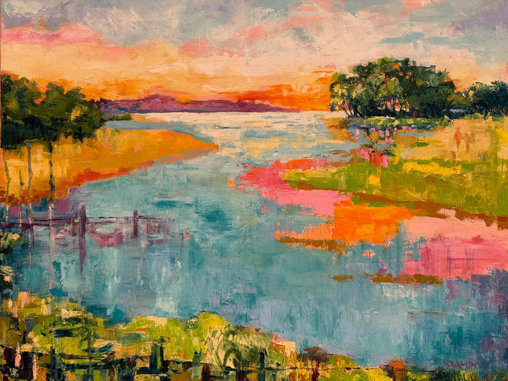 Piers and docks are expensive to build and repair. We see dilapidated docks everywhere in Savannah. Some are in front of beautiful homes on the Wilmington River, others are in creeks where they have been abandoned. This abstracted sunrise landscape shows a rickety dock in the middle of the painting and a decaying pier in the foreground. It was reworked several times in order to get the shimmering effect of the water.