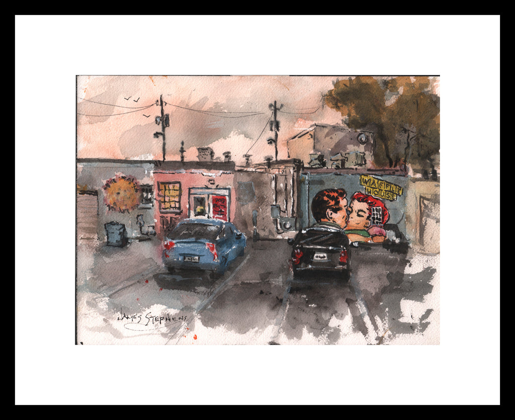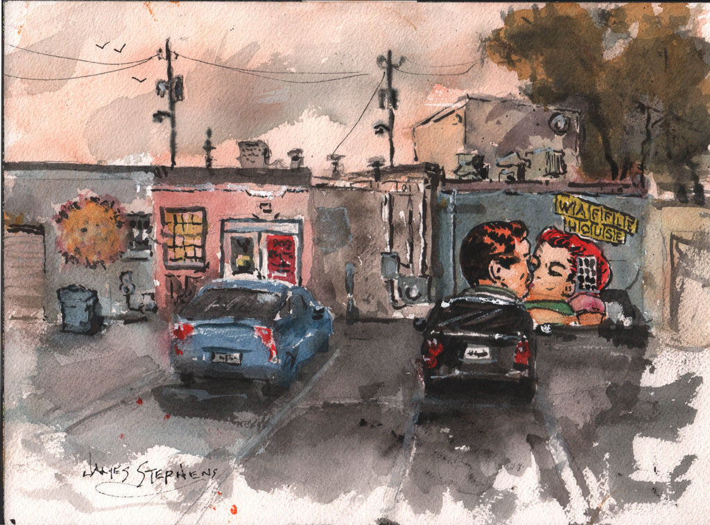 This intriguing image is hidden in a back parking lot in East Atlanta Village. I was fascinated by the wall art that most people would never see, so I stood there among the dumpsters and trash cans and delivery vehicles while I created this plein air painting.