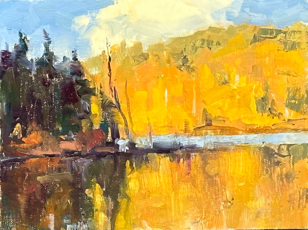 "Scott's Fall" captures the breathtaking beauty of fall as fiery orange forests stand in striking contrast to the calm, still waters of the lake. The crisp air seems to linger in the scene, enhancing the rich warmth of the foliage while the lake's glassy surface mirrors the golden hues above. The gentle movement of the water softens the reflection, blending reality and illusion into a mesmerizing dance of color and light.