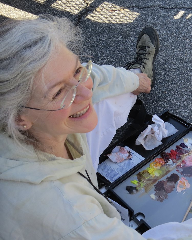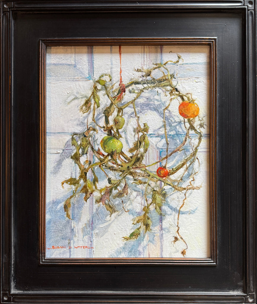 As I cleared spent tomato vines from the garden, one formed a loose wreath with small unripened fruit still attached. I hung it on the door of my studio and painted.