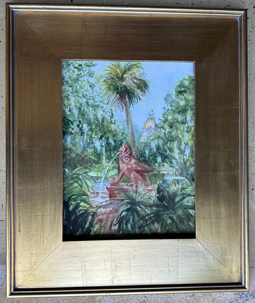 The terra cotta lion statue at the Savannah Cotton Exchange was destroyed when a car wrecked into it in 2008. A year later it was remade and placed in protected area with wrought iron gate and plants. Here is my rendition in watercolor.